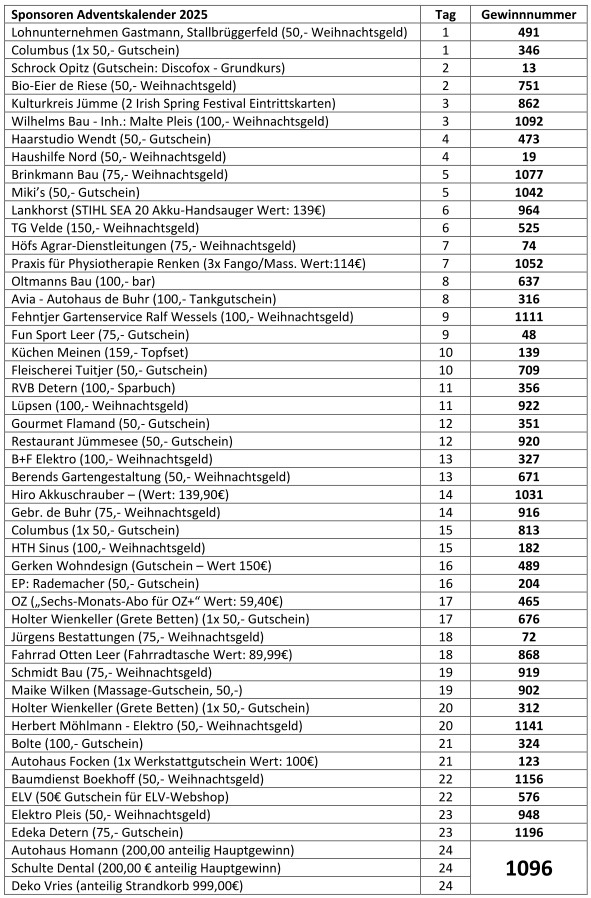 In regelmäßigen Abständen werden an dieser Stelle die Gewinnzahlen des Sponsoren-Adventskalenders des Fördervereins Kita und Grundschule Filsum e.V. veröffentlicht. Hier sind alle Zahlen bis zum 24.12.2025: